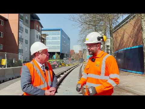 Councillor O'Boyle and and Hamish Falconer discuss the Coventry Very Light Rail Track